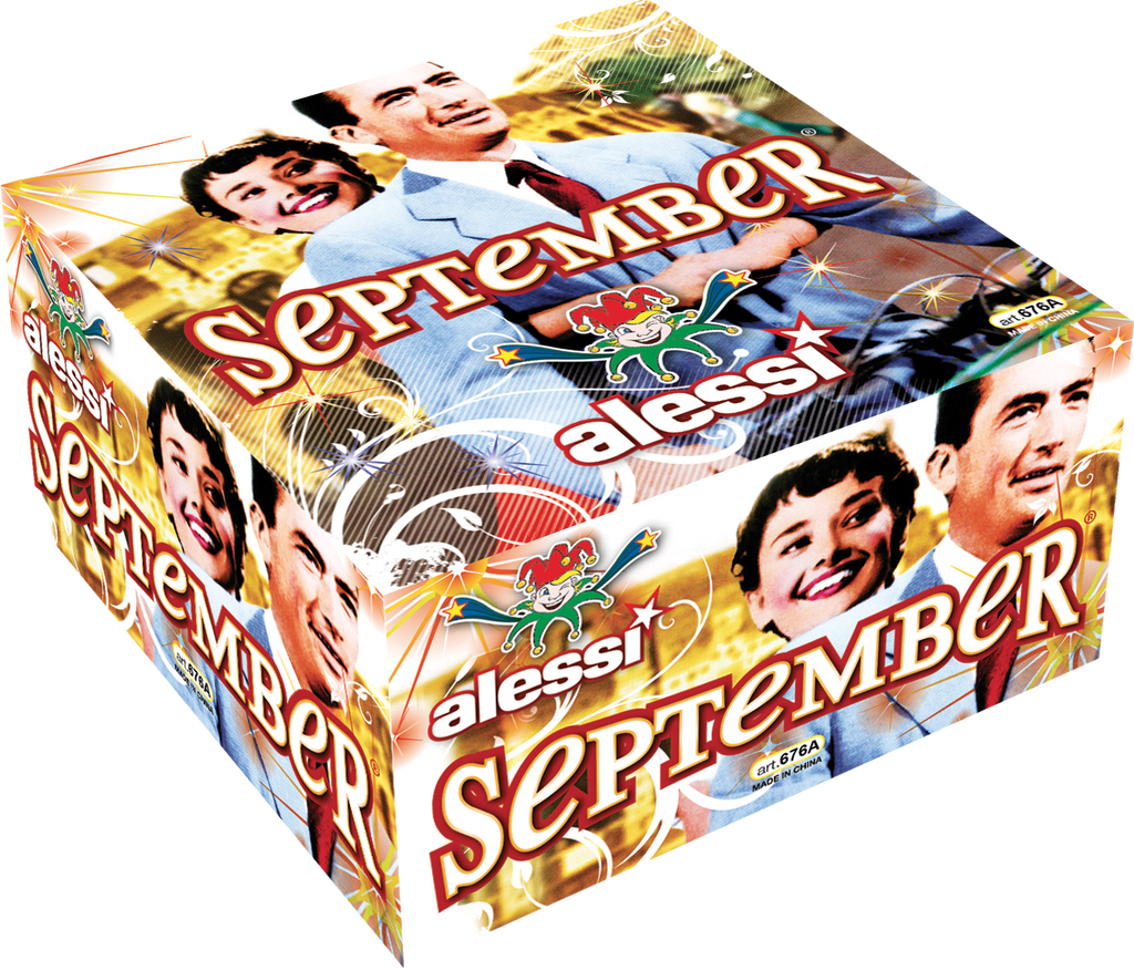 Fuochi d'artificio September effetto scia rossa/peonia rossa + scia verde/ peonia verde + scia blu/peonia blu + crisantemo oro; ultima fila mix color + chiusura al titanio